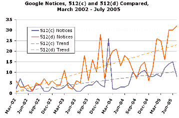 Search index complaints seem to be rising fastest in our present data set: even while Google is increasing its hosting offerings, the rate of increase in the 512(d) search engine notices is markedly higher than the 512(c) hosted content notices sent to Google. We elected not to include the self-reported notices in this section, as any “trend” we see could be confounded by growing popularity of the Chilling Effects site, growing public knowledge about cease-and-desist letters, or a number of other factors. The Google set is too limited in nature to inspire conclusions about the rate of 512 notices, generally. However, our nascent research on notices from ThePlanet also shows a likely upward trend overall; and anecdotal evidence from a confidential interview with a service provider representative suggests this, as well.