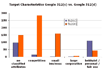 512(c) senders in our data set are often small Internet businesses. A large percentage of Google search notices—55% of the Google 512(d) notices—are competition-related. Entities send these notices to request the removal of links to their competitors. [9] (This phenomenon is discussed further, below.) The software and game industries sent 23% of the 512(c) notices (70 unique notices). These were largely related to circumvention of technological protection measures; a significant percentage included questionable copyright claims, including license restrictions, resales, game “cheats”, and the like.