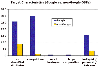 A second significant limitation is that the other set of notices is relatively small, and largely individually self-reported. As such, these notices may skew towards the substantively flawed; it seems plausible that individuals who have a strong defense (or at least believe there is a strong defense) are more likely to submit their notices to the Chilling Effects database. [7] We approached these notices cautiously; however, a third of the notices from Google relate to hosted material, rather than search index links. This gives us a non-self-selected group of notices related to hosted material, although, again, a group limited to one company. We make allowances for these flaws by separating the two sets in most analyses; additionally, we note places where our findings may be limited by the vagaries of the set. [8] Fortunately, the Chilling Effects project has also obtained an additional set of more than 1600 notices received by ThePlanet, a Texas-based web host and access ISP, from September 15, 2004 to the present. For near-future research, the ThePlanet data set will be very important for checking conclusions and comparing search engine and self-reported data with a complete set from a hosting service.
