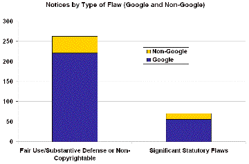 We first examined significant questions related to the underlying copyright claim, including fair use defenses, other substantive defenses, very thin copyright, or non-copyrightable subject matter. Fig. ES-6. A surprising thirty percent of the notices present claims that fall into this category. [10] As a rule of thumb, we tried to capture notices where a genuine dispute related to copyright infringement or defenses would clearly arise. Examples range from the clearly problematic—for example, recipes, prices and metatag information, which are unlikely to be covered by copyright—to instances of very thin copyright claims, such as website HTML “structure.” We also included notices where the target was likely to have a fair use defense. A much smaller number of notices in this category were counted due to other substantive concerns, such as questions regarding the ownership of the copyright in question: for example, a small number of notices appear to be sent not by the copyright holder or a representative, but by a party with some other interest in the material, such as the subject of a photograph. Among notices sent to Google, at least one type of flaw was apparent in 220 notices, or 30% of the Google set. Among the self-reported notices, 43, or, again, 30%, had at least one flaw.