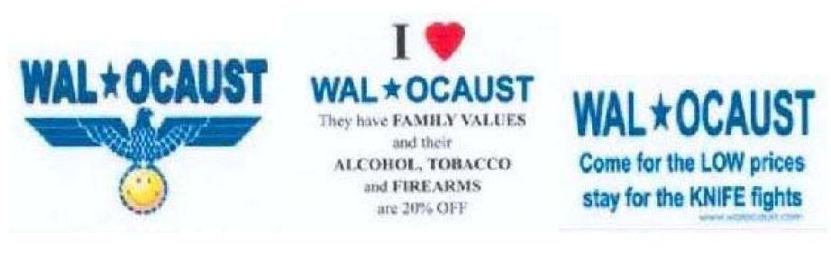 Smith created four basic Walocaust designs.[3] One design depicted a blue stylized bird modeled to resemble a Nazi eagle grasping a yellow smiley face in the same manner that a Nazi eagle is typically depicted grasping a swastika. Above the bird image, the word "WAL★OCAUST" was printed in a blue font comparable to that commonly used by Wal-Mart. Two designs were text only: one design read, "I ? WAL★OCAUSTH They have FAMILY VALUES and their ALCOHOL, TOBACCO and FIREARMS are 20% OFF"; and another design read, "WAL★OCAUSTH Come for the LOW prices[,] stay for the KNIFE fights." The fourth was a graphical design that depicted the word WAL★OCAUST on a Wal-Mart-like storefront that also included the Nazi eagle image, a poster advertising family values and discounted alcohol, tobacco and firearms, and other images commenting negatively on Wal-Mart.