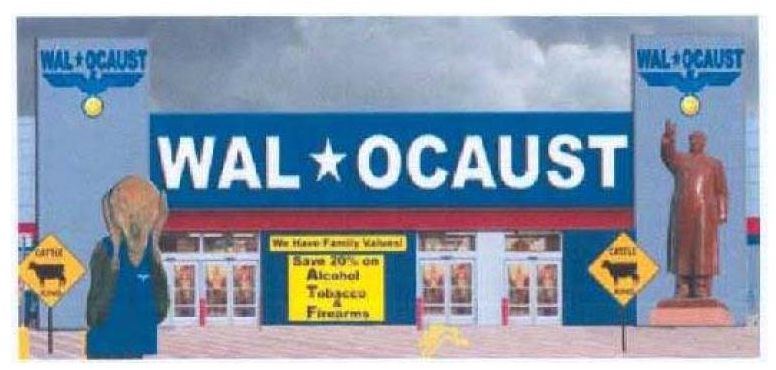 Finally, the juxtaposition of the similar and dissimilar — the satirical representation and the idealized image of Wal-Mart 1317 — conveys a scathing parody. In the "smiley eagle" Walocaust concept, the reference to the Holocaust and the image of the Nazi eagle clutching a smiley face at once portrays and contradicts the benign image that Wal-Mart portrays to the community. In the "SUPPORT OUR TROOPS" Wal-Qaeda concept, Smith transforms all-American "Wal-Mart" into the terrorist group "Wal-Qaeda" and satirically urges the viewer to support Wal-Qaeda's troops, apparently commenting both on what Smith considers to be Wal-Mart's ruthless business tactics and its detrimental impact on the United States. Other concepts juxtapose Wal-Mart's reputation for low prices with a reference to poor store security and the company's family values imagery with the fact that it offers for sale inexpensive alcohol, tobacco and firearms — products known better for destroying families.
