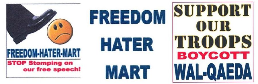 Once he became certain that CafePress was open to carrying his new Wal-Qaeda concepts, he created a new Wal-Qaeda CafePress webpage where he again offered various items commenting on Wal-Mart.[8] All of the products offered on 1312 Smith's new Wal-Qaeda CafePress webpage incorporated the word "Wal-Qaeda" except for three concepts: one imprinted with a graphic depicting a shoe hovering over a yellow unhappy face with the legend "FREEDOM-HATER-MART STOP Stomping on our free speech!"; another with the legend "BENTON★VILLEBULIES ALWAYS"; and a third reading simply, "FREEDOM HATER MART."