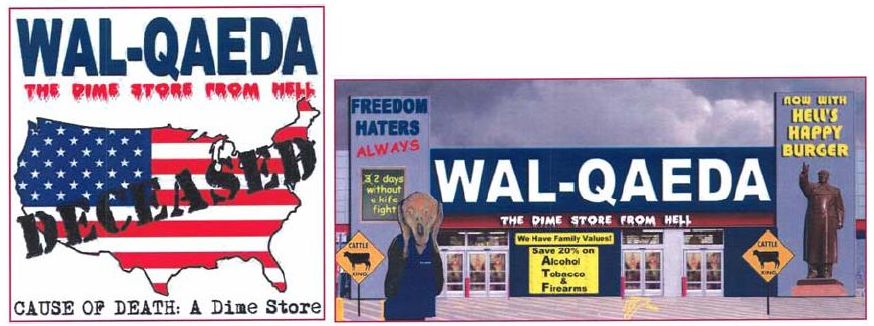 The site also offered products imprinted with five other graphical concepts. One of those concepts was a revision of the Walocaust storefront design, altered to replace "WAL★OCAUST" with "WAL-QAEDA[.] THE DIME STORE FROM HELL"; to replace the Nazi eagle with "FREEDOM HATERS ALWAYS" and "2 days without a k[n]ife fight"; and, to make other small changes. Another concept depicted an American flag in the shape of a United States map with the word "DECEASED" stamped over it. Above the flag was printed "WAL-QAEDA[.] THE DIME STORE FROM HELL," and under the flag appeared the phrase "CAUSE OF DEATH: A Dime Store." In the third concept, the slogan "ATTENTION WAL★QAEDA[.] THESE COLORS DON'T RUN" was imprinted over a modified American flag, and in the last two concepts, Hillary Clinton was named the "WAL-QAEDA Employee of the Year 1986-1992," and Chairman Mao Zedong was awarded the "WAL-QAEDA Human Resource Achievement Award."[9]