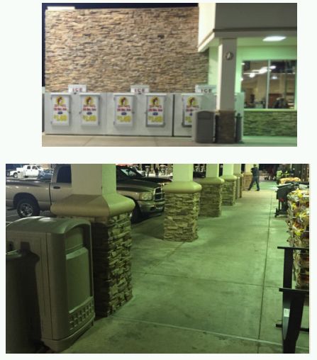 Remember ¶25(h)? (h) Use of square column of beige stone on first few feet of pillars in the front of the store. Here are pictures of the "columns". Round column on the left, square column on the right. The columns by the gas pumps are very different. When did Buc-ee's get absolute rights to using beige stone in Texas, or anywhere else for that matter. |