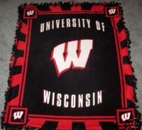 The front side shows a large University of Wisconsin logo on a black background with a red and black border, highlighted with the UWM logo in each corner. The back side proudly shows Badger black. They are brought together nicely with decorative knots all around the outer edges.